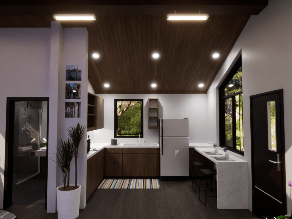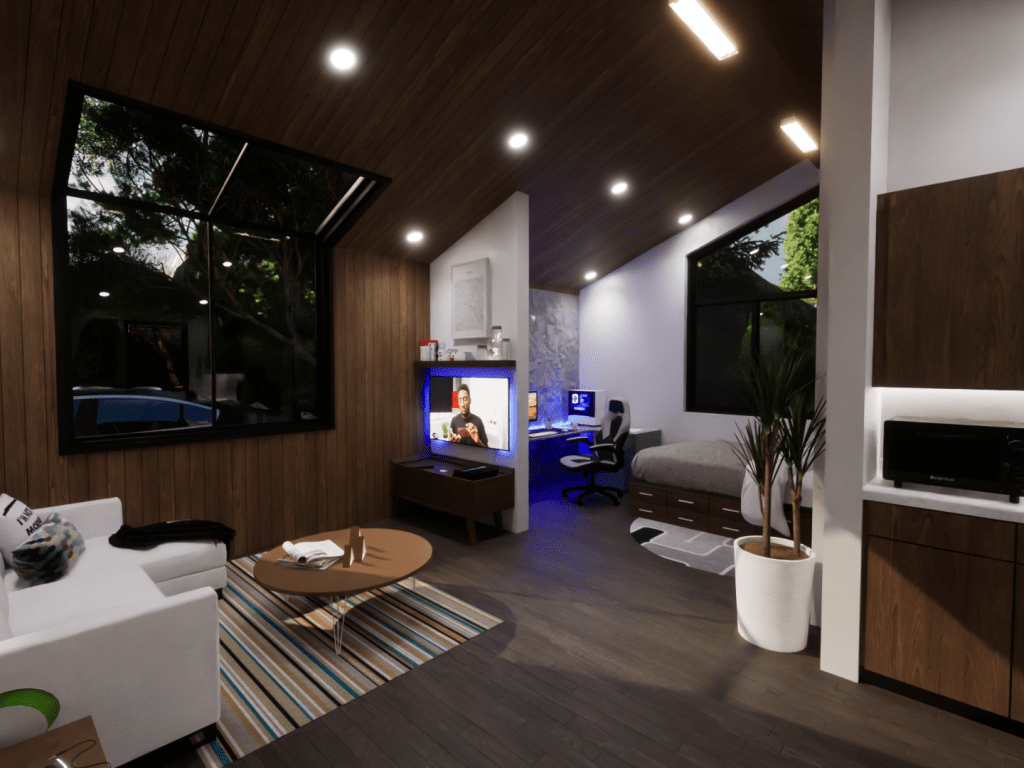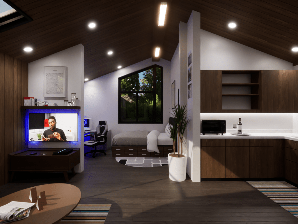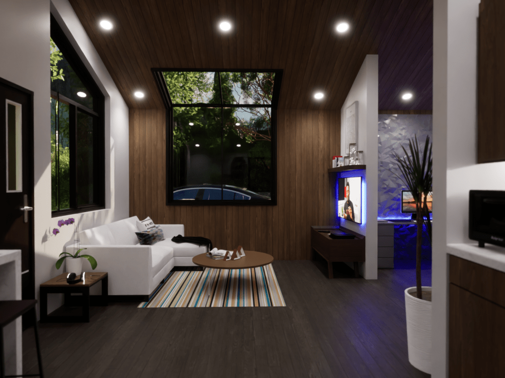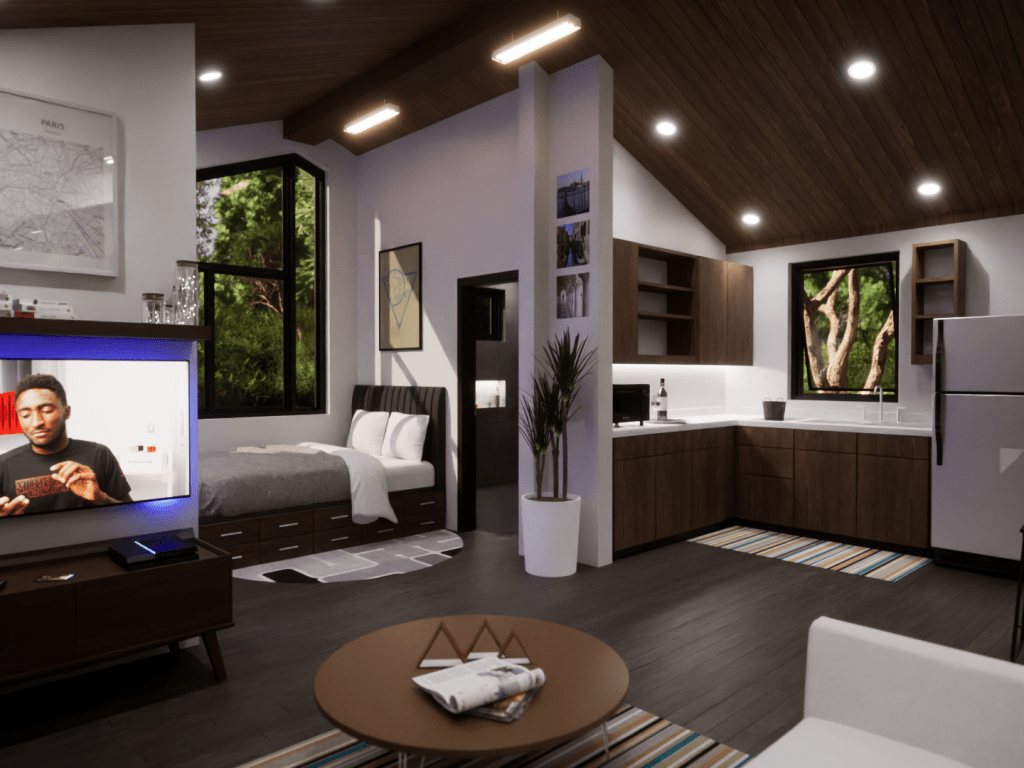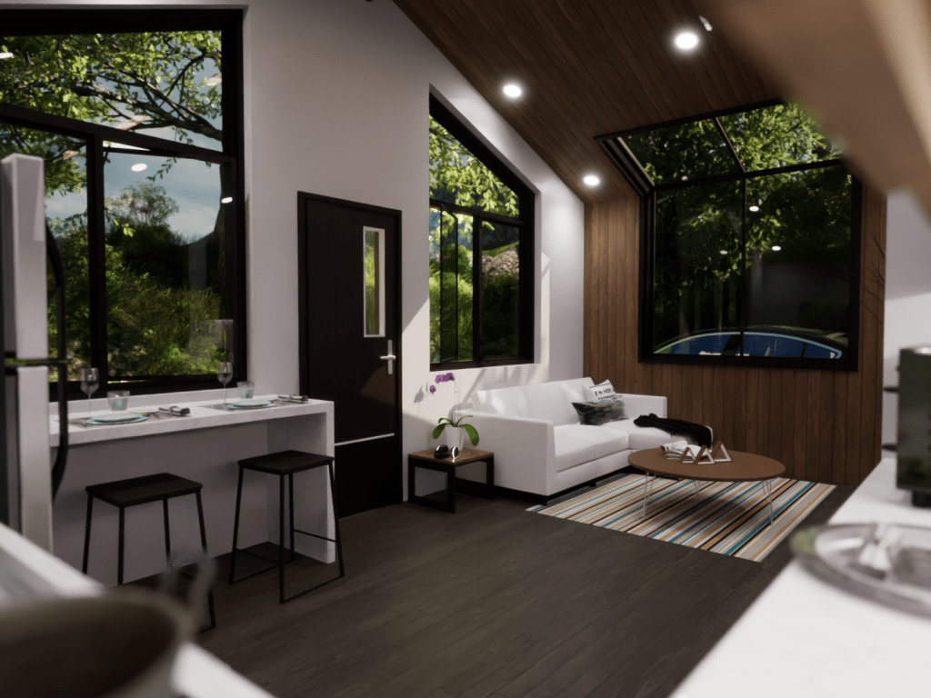 This model displays the efficient use of a 20×20 footprint to create a quaint 400 square-foot living space suited for a young professional working from home. The unite is outfitted with a kitchen/dining room, living room, bedroom/office, and a bathroom.