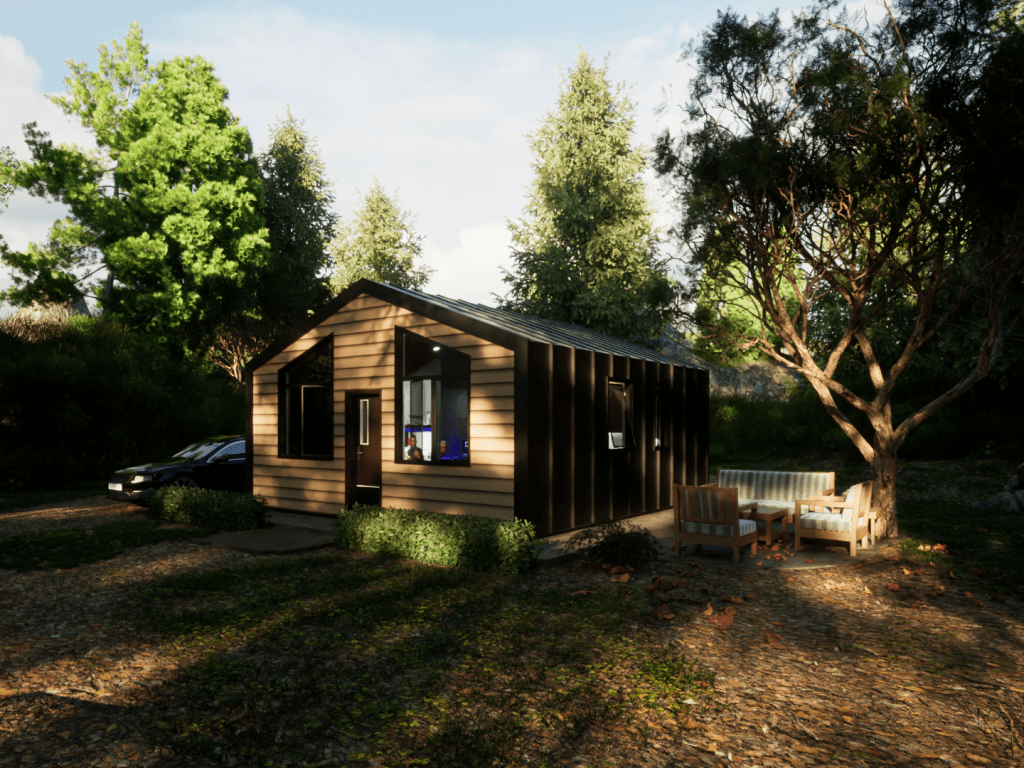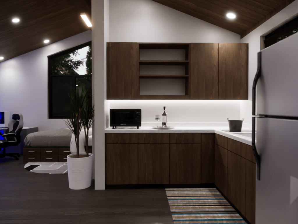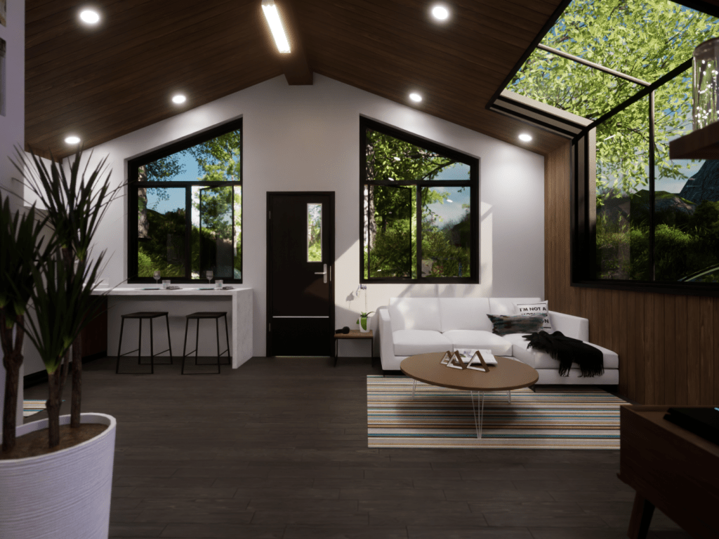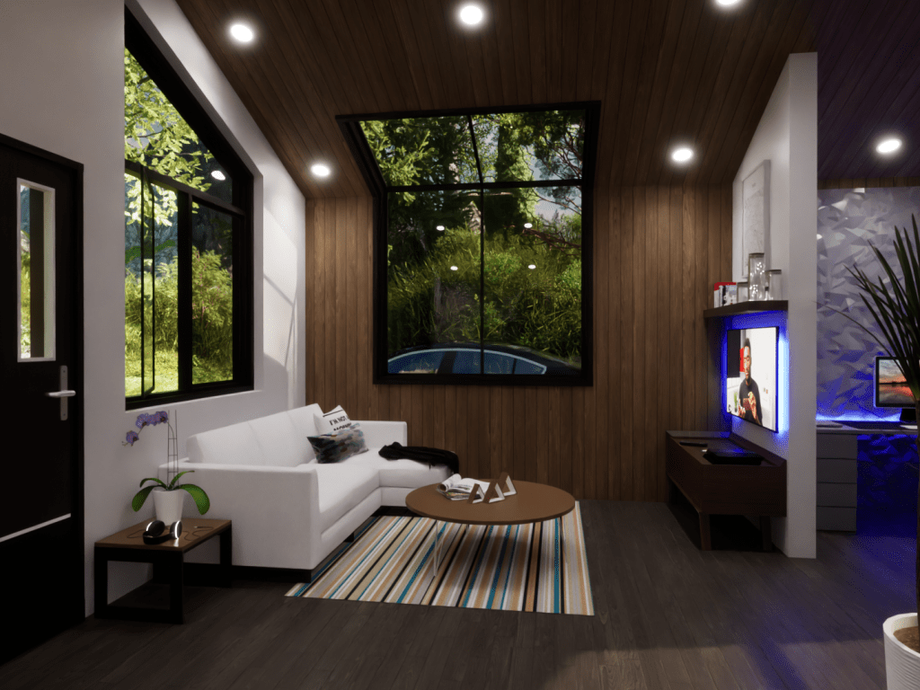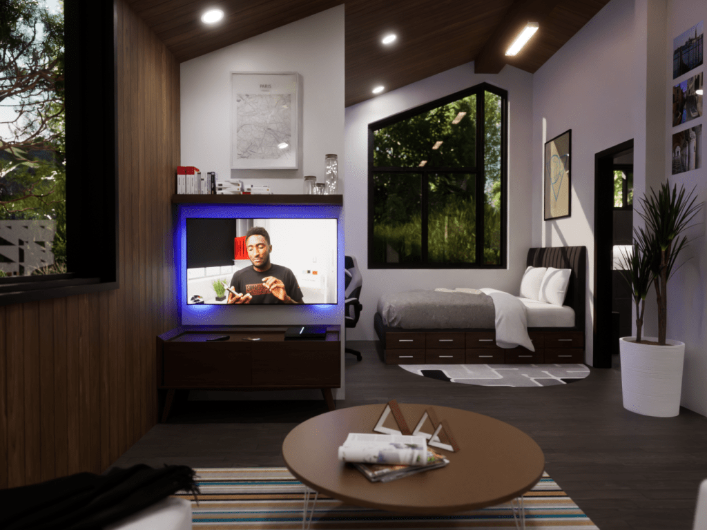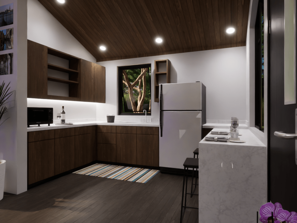 This model displays the efficient use of a 20×20 footprint to create a quaint 400 square-foot living space suited for a young professional working from home. The unite is outfitted with a kitchen/dining room, living room, bedroom/office, and a bathroom.