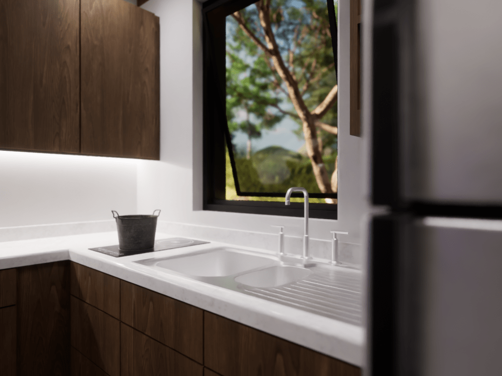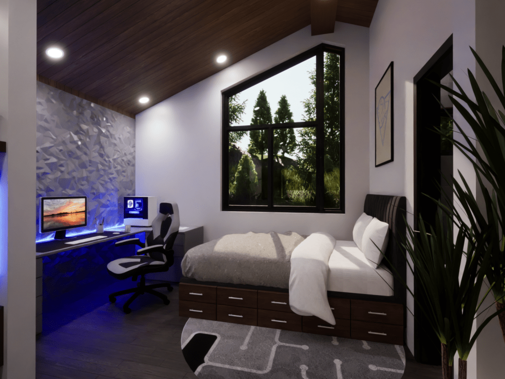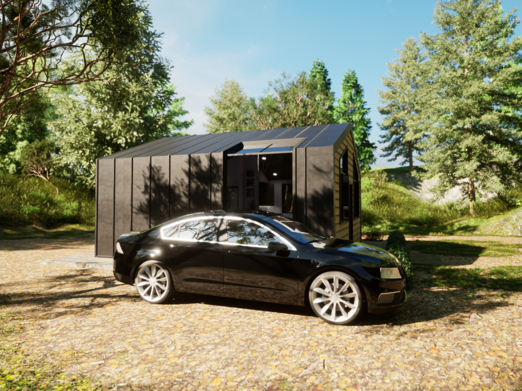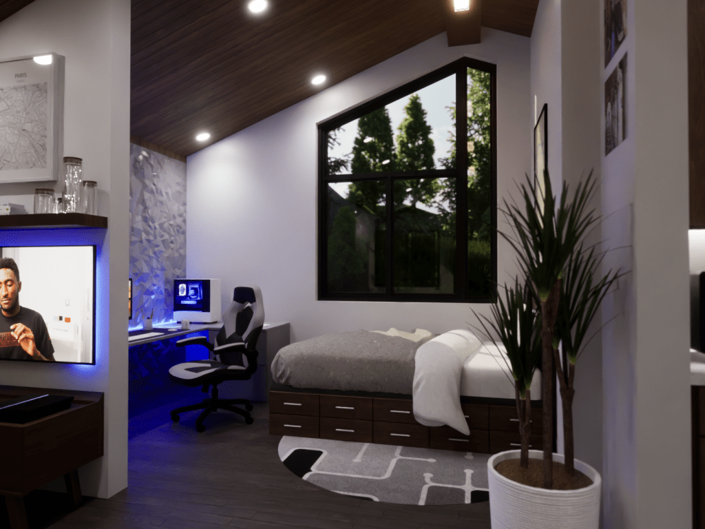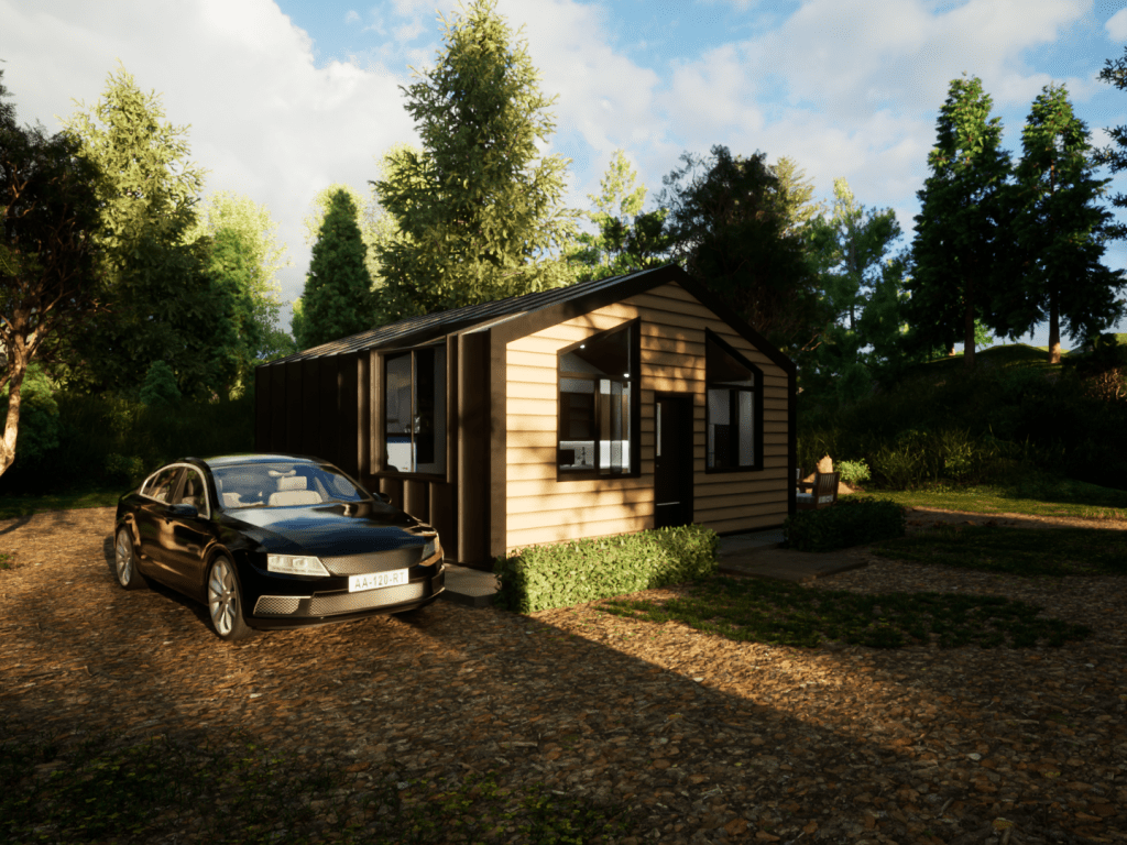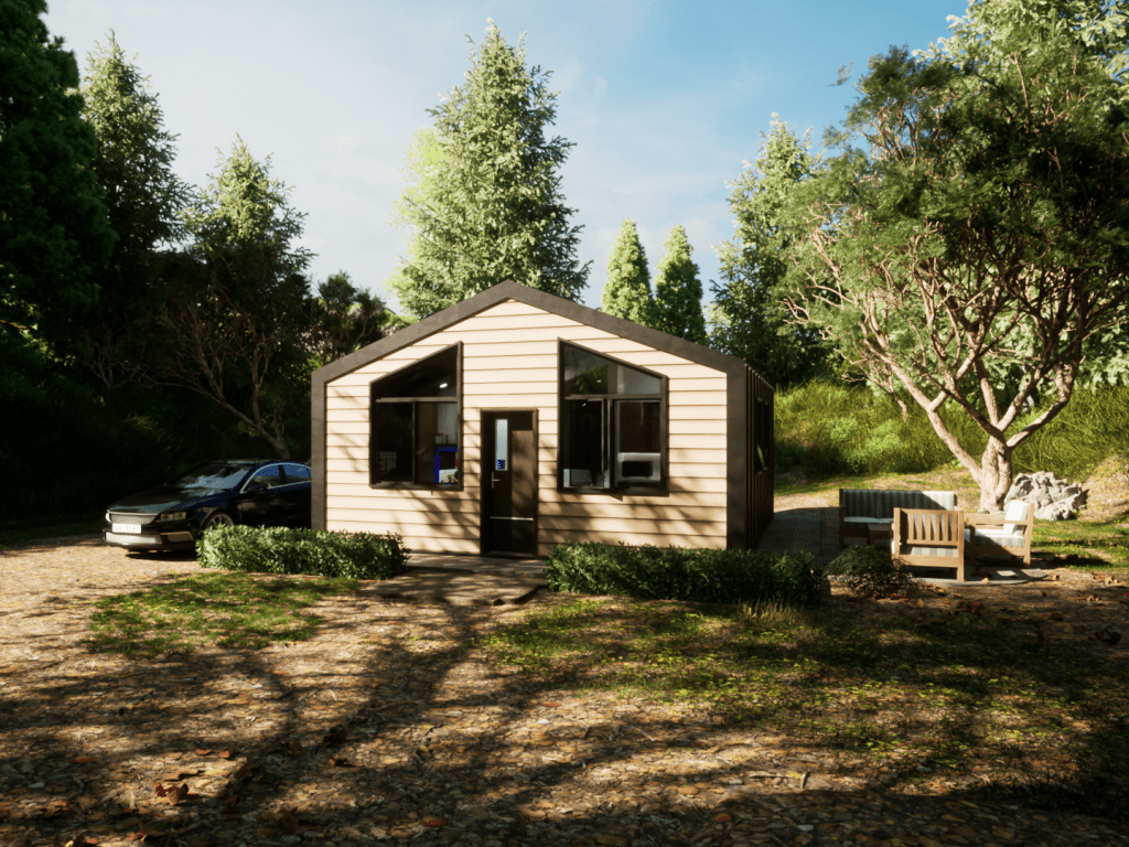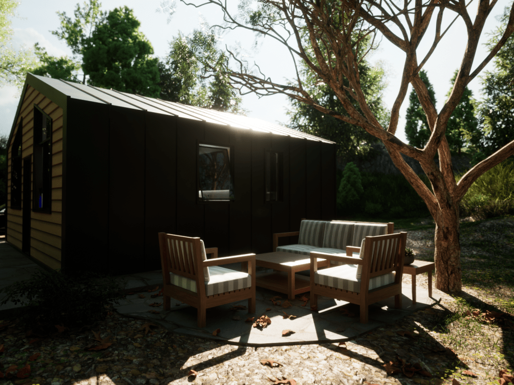 This model displays the efficient use of a 20×20 footprint to create a quaint 400 square-foot living space suited for a young professional working from home. The unite is outfitted with a kitchen/dining room, living room, bedroom/office, and a bathroom.