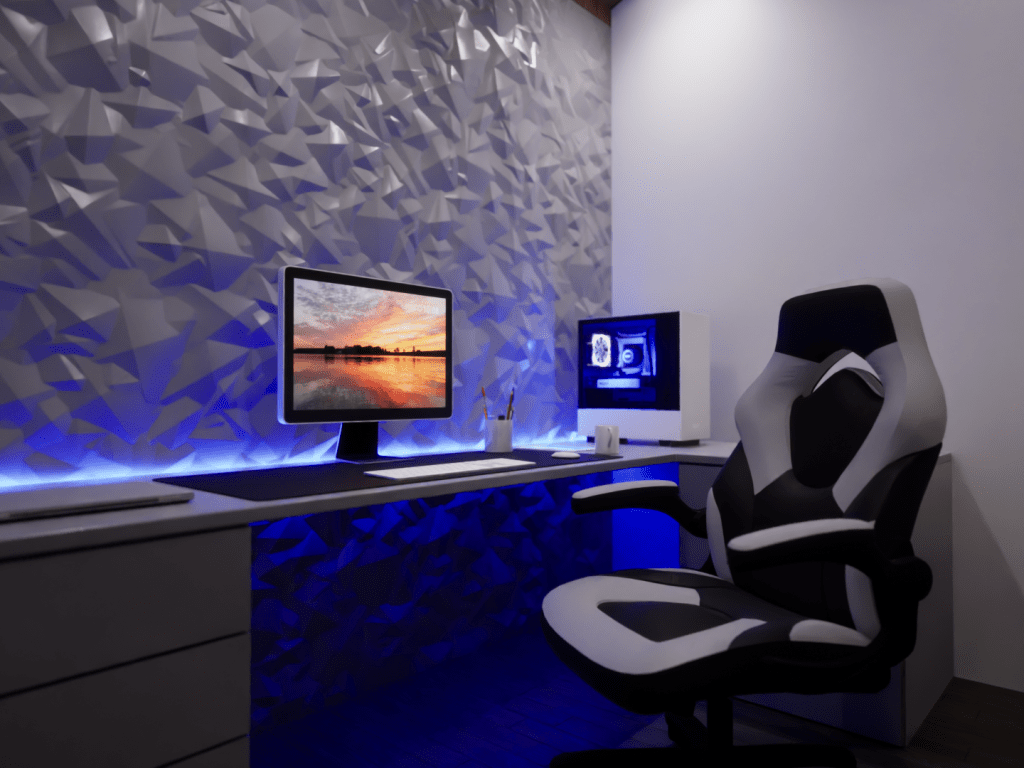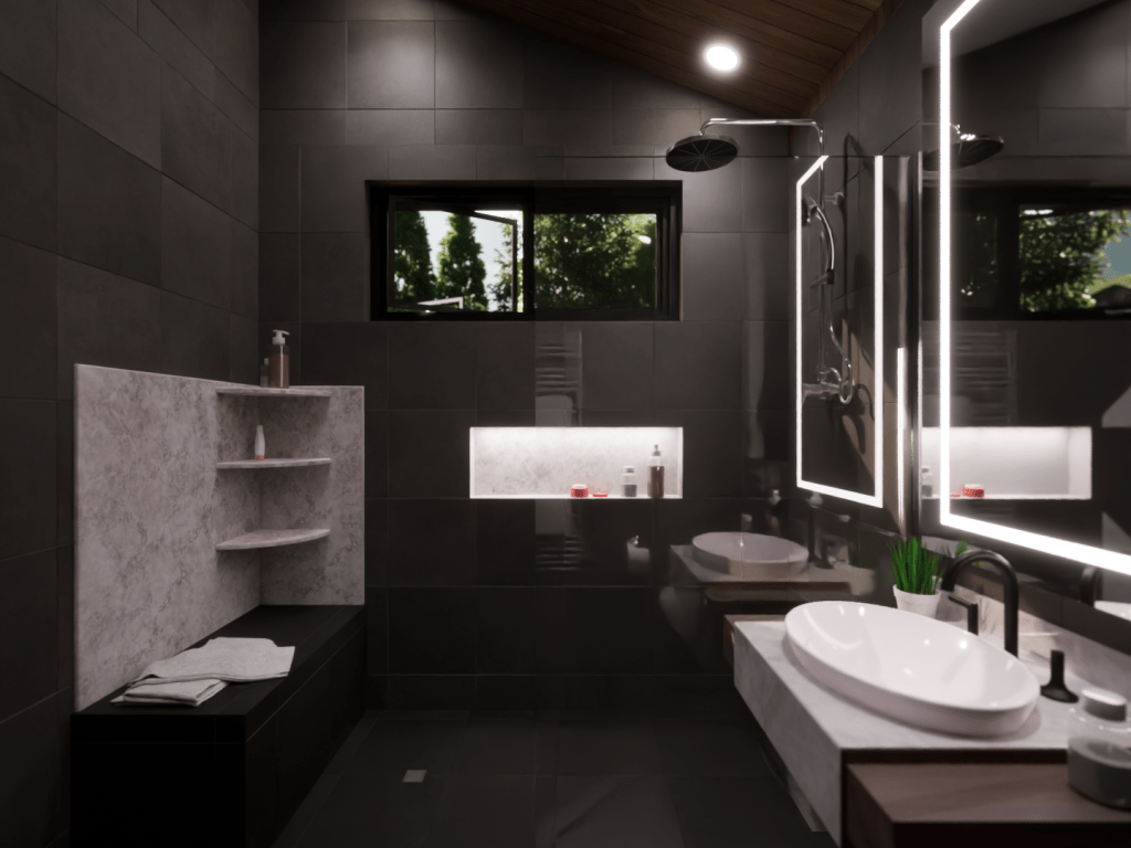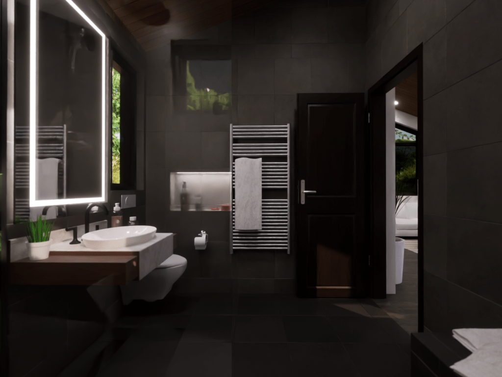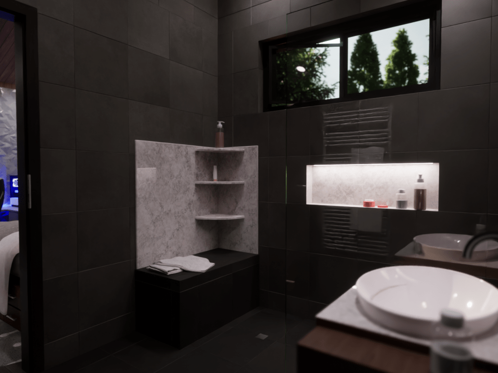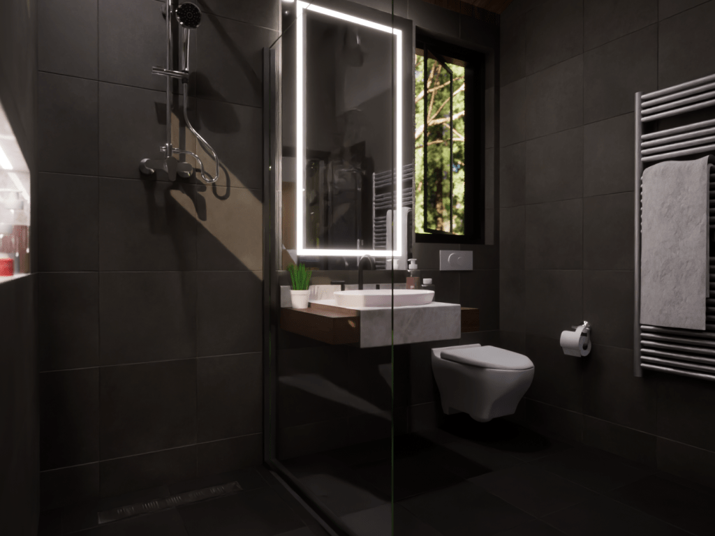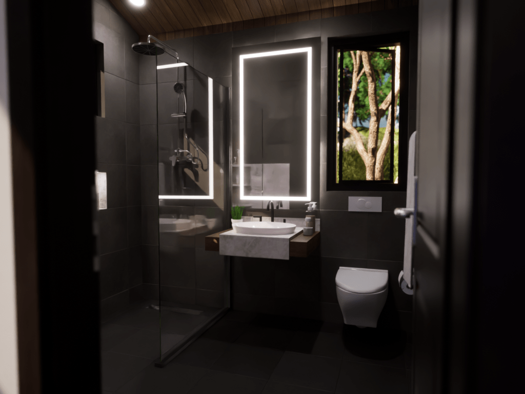 This model displays the efficient use of a 20×20 footprint to create a quaint 400 square-foot living space suited for a young professional working from home. The unite is outfitted with a kitchen/dining room, living room, bedroom/office, and a bathroom.
